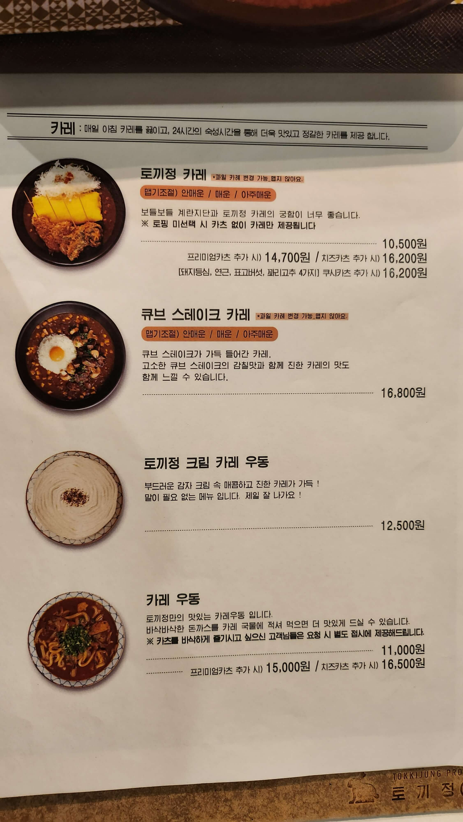 대구 신세계 일식 맛집 토끼정의 메뉴입니다. 메뉴 엄청 다양하죠? 외부에서 쿠시카츠 사진을 보고 저거 먹고 싶다며 정한 토끼정이었는데 저희는 저렇게 많은 메뉴를 보다 정신이 혼미해지기 시작했고 그 와중에 쿠시카츠에 여러가지 야채 튀김들이 함께라는 것을 보고 그냥 돈까스를 먹기로 하였습니다. 나는 고기가 먹고 싶어를 시전했죠! 토끼정카레에 프리미엄카츠를 추가하고 바질 새우 크림파스타를 주문했어요. 토끼정하면 예전에 크림카레우동이 유명했잖아요. 그 기억이 나서 카레가 먹고 싶어져 선택했는데 먹어보니 정말 괜찮은 선택이었던 것 같습니다. 세트메뉴도 구성이 좋았으나 너무 많을 것 같았고 먹고 싶은 걸 골라 먹고 싶었기에 저희는 단품으로 주문했어요.