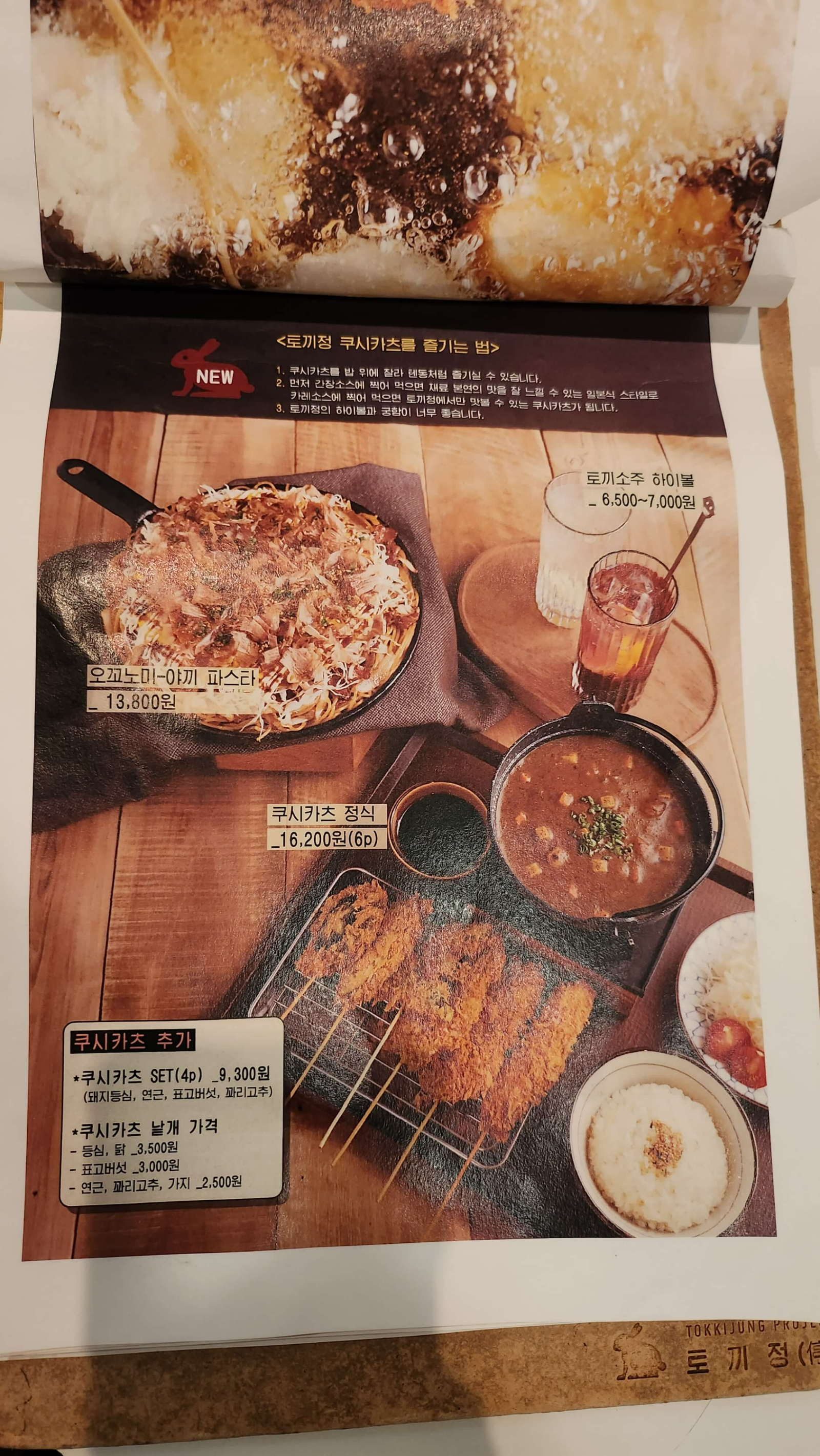 대구 신세계 백화점 구경을 하다 출출해져서 밥을 먹기로 했어요. 뭘 먹지 고민하다 8층으로 올라와 보았답니다. 많은 음식점들이 있었는데 지나가다 쿠시카츠를 보고 어 저거 맛있겠다! 를 외치며 토끼정으로 정했답니다. 토끼정 메뉴가 너무 많아서 오히려 저기 요약 되어 있는 게 더 보기 좋으실 것 같아요. 저 같은 결정 장애는 메뉴가 많으면 제법 힘에 부친답니다. 지나가면서 많이 봤지만 처음으로 신세계 토끼정에 입문해 보았어요~
