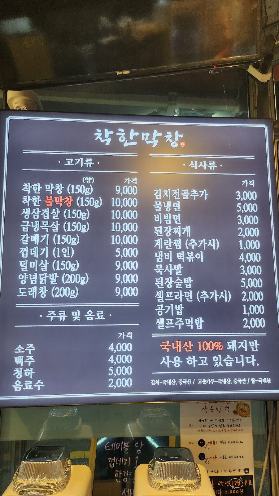 대구 세천 막창 맛집 착한막창은 내부 인테리어와 테이블도 깔끔하고 분위기가 제법 좋았답니다. 그리고 무엇보다 고기 주문 시 테이블 당 김치찌개, 계란찜, 셀프라면이 무료라는 점! 거기에 돼지 껍데기도 주신답니다... 이래서 가게이름이 착한막창인가봐요! 착한막창 세천점 짱! 착한막창 세천점의 메뉴 공유해드립니다. 그렇다고 막창의 가격이 비싼 편도 아니예요. 일반적인 금액인데도 불구하고 이렇게 많은 서비스를 주신다니... 믿을 수가 없답니다. 서비스는 1회 제공이고 추가 시 추가 비용이 들지만 그래도 가격이 저렴한 편이라 부담없이 즐기실 수 있을 것 같아요. 차만 없었다면 소주 등장이었을텐데 아쉬웠습니다.