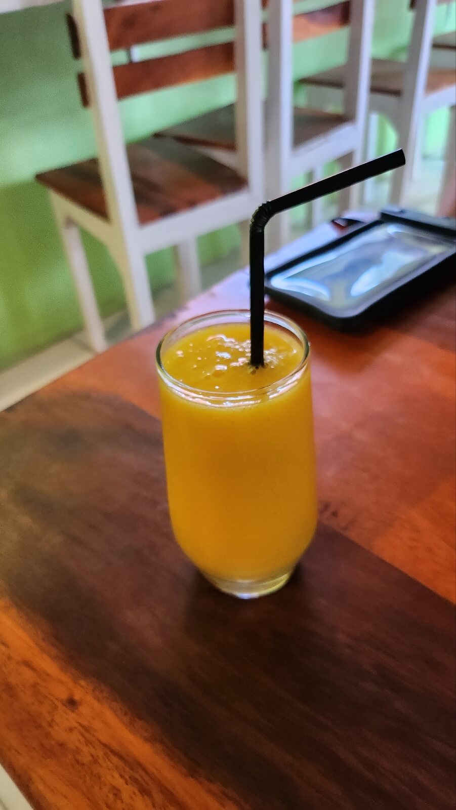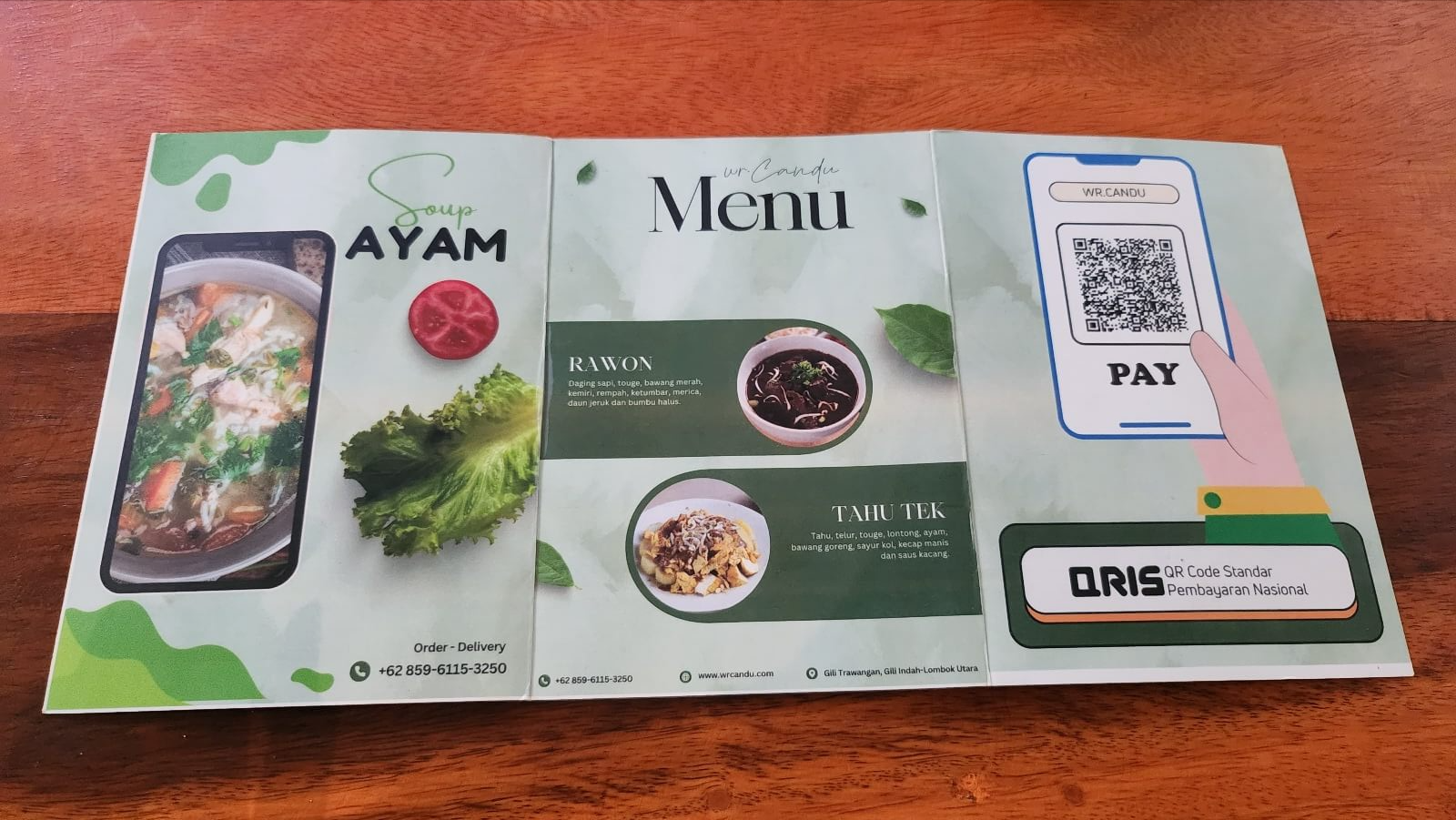 물에 홀딱 젖었지만 길리의 햇살 아래 자전거로 쌩쌩 달리다보면 어느새 몸은 다 말라 있답니다. 참 신기하죠? 마른 가디건을 챙겨와 그걸 걸치고 다니면 꼴이 좀 말이 아니지만 그래도 보송보송하게 다닐 수 있답니다! 저희는 자전거 주차 후 WR BB KONTEMPORER에 들어갔어요. 현지 맛집이다보니 현지 사람들로 보이는 분들만 계셨어요. 저 이런 거 너무 좋아하거든요! 자리를 잡고 앉으니 메뉴판을 가져다 주셨어요. 저희는 미고렝, 사테를 주문했어요. 일단 먹어보고 더 시키든지 고민을 하자며 메뉴 두개와 망고 쥬스를 주문했어요.