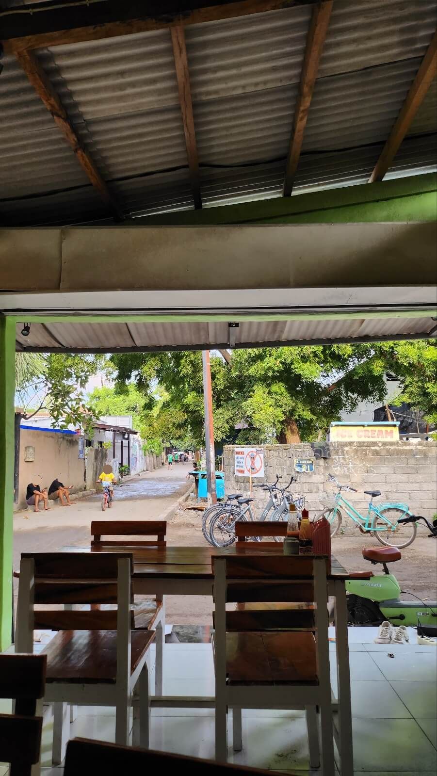 가지런히 놓여있는 신발이 보이네요. 저희도 벗어놓고 자리에 앉았답니다. 세워진 자전거와 현지 분위기까지 한 폭의 그림같네요. 새삼 남는 건 사진인 것 같습니다. 바 테이블 자리도 있어서 혼밥하기에도 좋을 것 같다는 생각을 했어요. 혼자 여행 온 여행객들도 이용하기 좋을 것 같아요! 길리 현지 맛집이니 유명한 곳만이 아닌 현지 분위기를 크게 느끼고 싶으신 분들께 강력 추천드립니다!