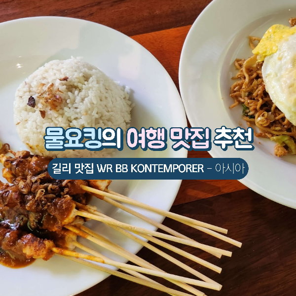 안녕하세요~ 오늘은 길리 현지 맛집을 소개해드리려고 합니다. 슬슬 발리 여행 컨텐츠도 바닥을 드러내기 시작했네요. 천천히 정리하면서 쓰다보니 한참을 보여드린 것 같아요. 발리 여행 준비하시는 분들께 좋은 글이 되길 바라 봅니다! 오늘 소개할 곳은 WR BB KONTEMPORER인데요. 줄여서 더블유알 비비라고 하겠습니다. 발리에 왔으면 인도네시아식을 꼭 먹어봐야겠죠?! 나시고랭과 미고랭, 그리고 사테가 먹고 싶어서 검색하던 중 원래 가려고 한 곳은 오늘 장사 접었다고 내일 오라고 하셔서 근방에 있는 음식점을 찾다가 여길 발견하게 되었어요.