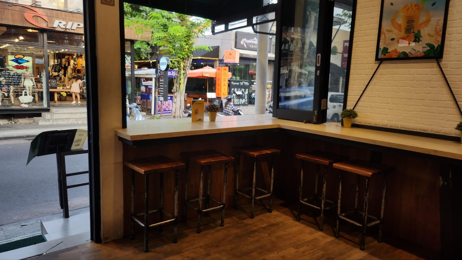 Dod's burger 메뉴를 보던 중 망고스무디가 있어 나갈 때 꼭 테이크아웃해서 가기로 한 후 잊을 뻔 했지만 부닥부닥 기억해서 손에 거머쥐고 행복한 저랍니다. 여기 망고스무디도 맛있으니 드셔보세요! 더운 발리를 사악 내려주는 시원한 맛이랍니다! Dod's buger의 인테리어입니다. 너무 예쁘죠? 그치만 이 가게의 최대 단점이 하나 있는데요. 감성을 위해 테이블 사이즈가 협소해 굉장히 불편하다는 점입니다. 바테이블은 그나마 본인 트레이 올려두고 식사할 수 있지만 저희가 선택한 자리는 둘이서 테이블을 공유해야했는데 세상에 어마무시하게 작더라구요.
