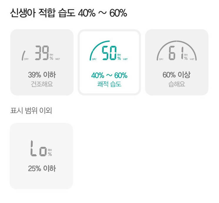 거기다가 엄청 귀여운 게 뭔지 아시나요? 저렇게 아이가 괜찮은 온도면 웃고있고 추우면 무표정+정색이고 더우면 울상에 땀을 삐질삐질 흘리고 있어요. 너무 신기하고 귀엽죠? 실제로 여름에 해당 제품을 개봉해 사용해보니 화면 상의 아기가 더워서 울고 있더라구요. 이거 보라며 엄청 신기해하고 웃었답니다. 조리원에서 들은 아기가 생활하기 좋은 적정온도는 24~25도라고 해요. 사실 저 온습도계가 있어도 추위를 많이 타는 저에게는 현재 실내온도 24도여도 춥게 느껴져서 아기 더 입혀야하는 거 아닌지 고민에 고민을 거듭하고 있는 초보엄마랍니다. 아기 습도는 40~60%가 좋다고 해요! 초보 엄마는 이런 정보도 소중하답니다~