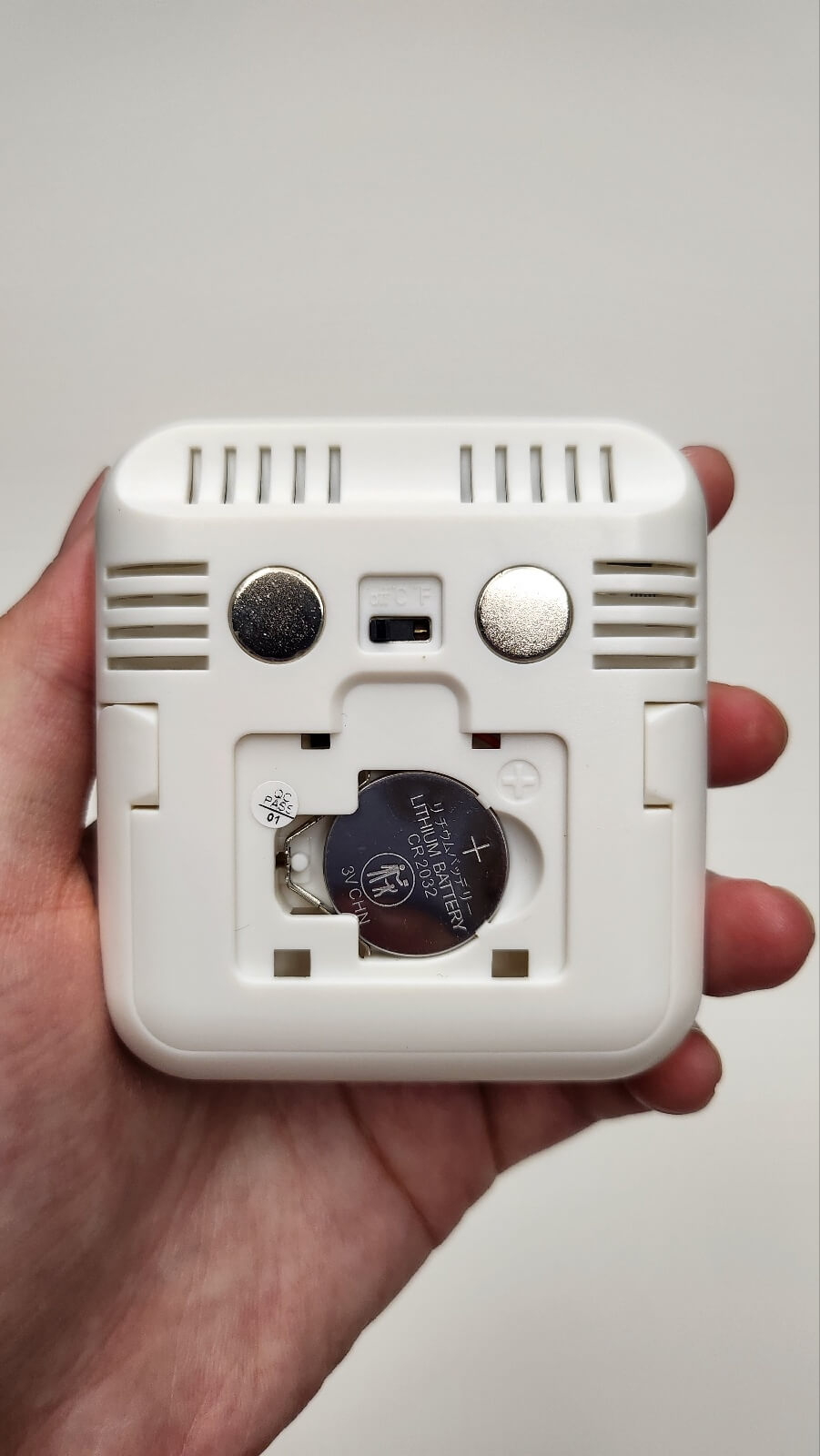그렇게 얻게 된 마더케이 온습도계! 집에 와서 개봉해보니 아주 컴팩트하고 깔끔한 외양을 하고 있었어요. 뒤쪽 배터리 놓는 곳에 필름을 제거해주면서 거치식 다리도 발견해 세워보았습니다. 저는 세워둘 계획이었으나 자석도 있어 어떤 방식이든 자유자재로 사용할 수 있는 것에 센스를 느낄 수 있었어요.