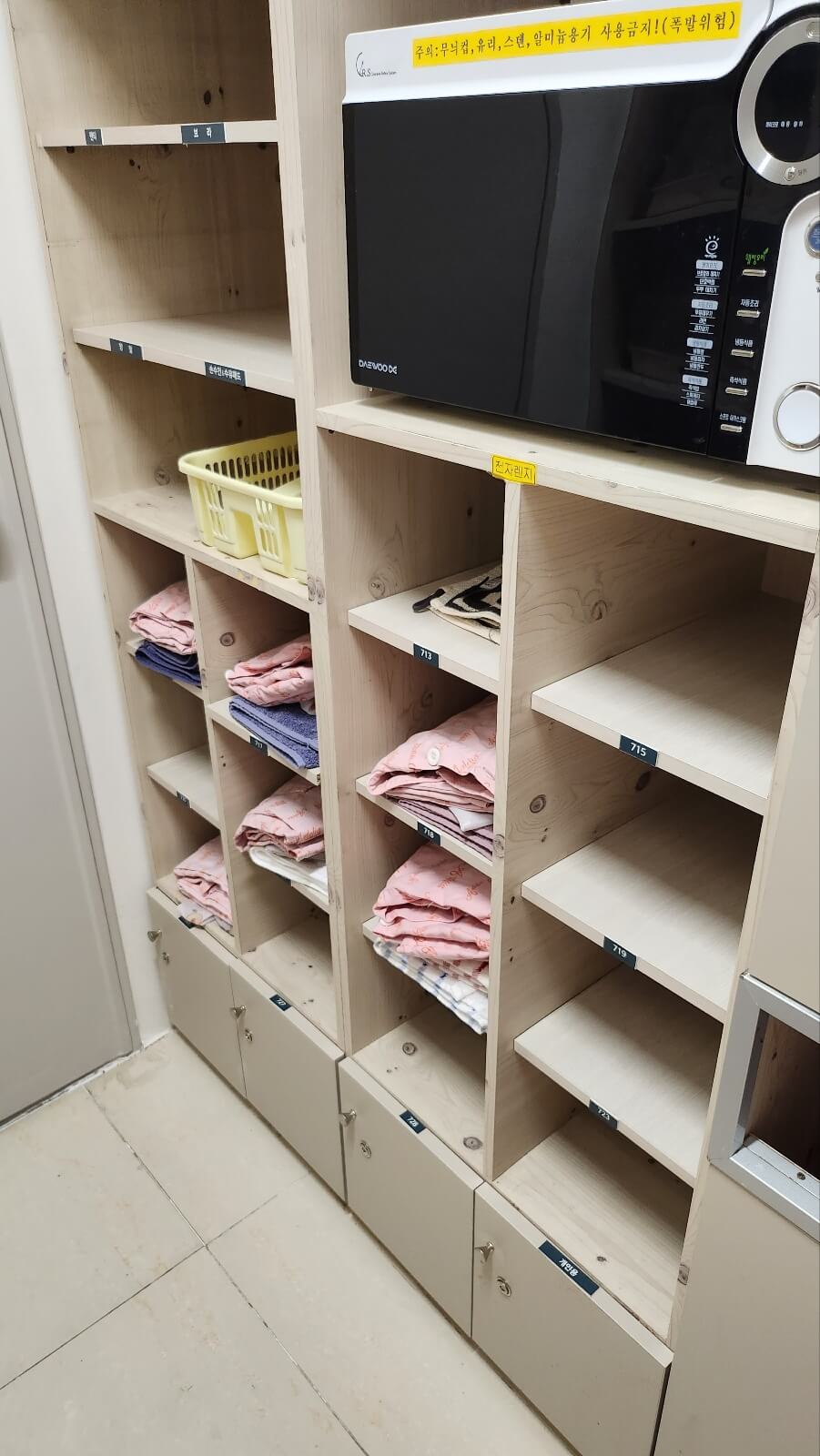 그리고 공용 공간을 보여드리자면 각 호실 별로 세탁물을 정리해서 매일매일 세탁해서 넣어주세요. 너무 편하죠? 처음에 블로그 후기들 찾아볼 때 도저히 어떤 시스템인지 모르겠는데 실제로 가보면 금방 적응 한답니다. 전용 세탁망에 넣은 거는 그대로 돌아오는데 나머지 개인 빨래감은 본인이 찾거나 표식을 해줘야해요. 실제로 한국은 자전거빼고는 아무것도 안 훔쳐가니까 그냥 수건을 내놨는데 세상에 수건은 비슷한 게 너무 많다는 걸 생각을 못했어요. 그래서 수건을 하나 잃어버리고는 라벨에 제 호수를 적어서 내놨어요. 그 후로는 제 칸에 빨래감이 넣어져있어서 더 편하고 안전하게 이용할 수 있었어요. 그리고 입실 선물로 받았던 수면조끼와 보냉백 보여드릴게요.