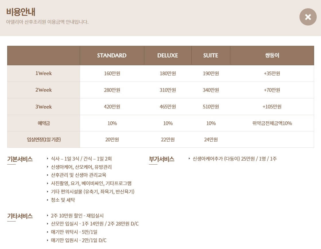 그렇게 쫓겨난 후 남편과 근처 카페에서 데이트를 즐긴 후 다시 조리원으로 돌아갔어요. 퇴원하면서 통증 주사를 맞고 나왔기에 제법 잘 돌아다녔답니다. 약빨이 떨어지며 다시 고통이 찾아왔지만... 그래도 지나고 나니 괜찮네요~ 아델리아 산후조리원 가격은 우선 기본적으로 제일 많이 하는 2주 기준으로 스탠다드룸 280만원이었어요. 처음에 이 가격 봤으면 놀랐겠지만 300만원이 넘어가는 곳도 수두룩하더라구요. 제가 고민했던 한 곳이 300이 넘었기에 아델리아로 정하게 되었어요. 입실하면서 이거저거 쓸게 많아 쓰면서 가격표와 아델리아 산후조리원 프로그램 스케줄도 함께 찍어보았어요. 교육은 다 들어야지 해놓고 초점책과 퇴실교육만 들은 저 레전드... 너무 힘든데 어떡합니까...