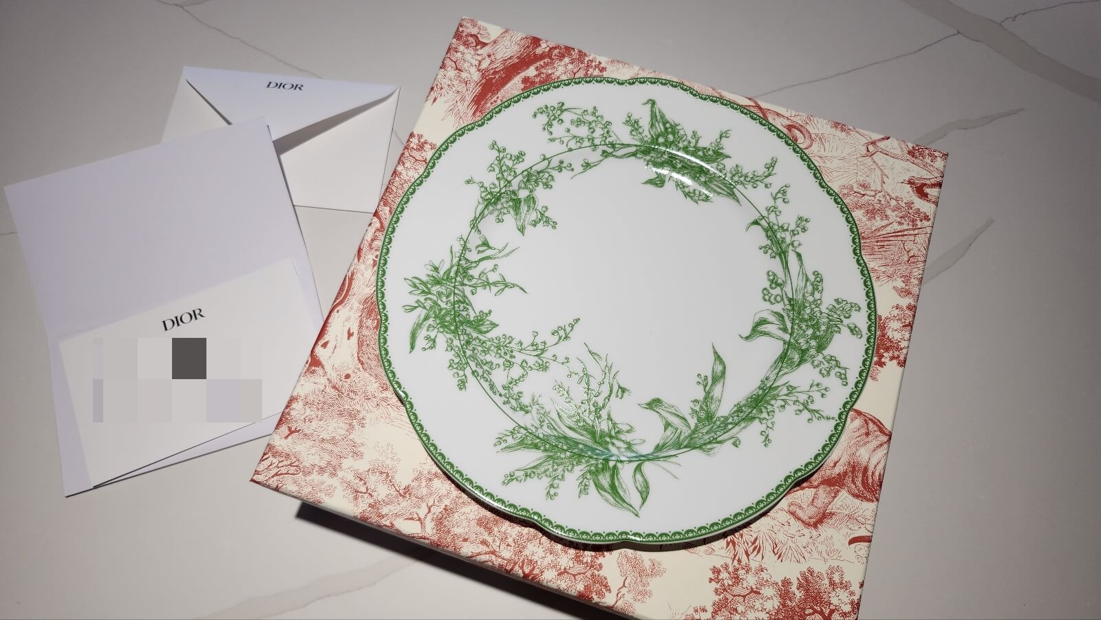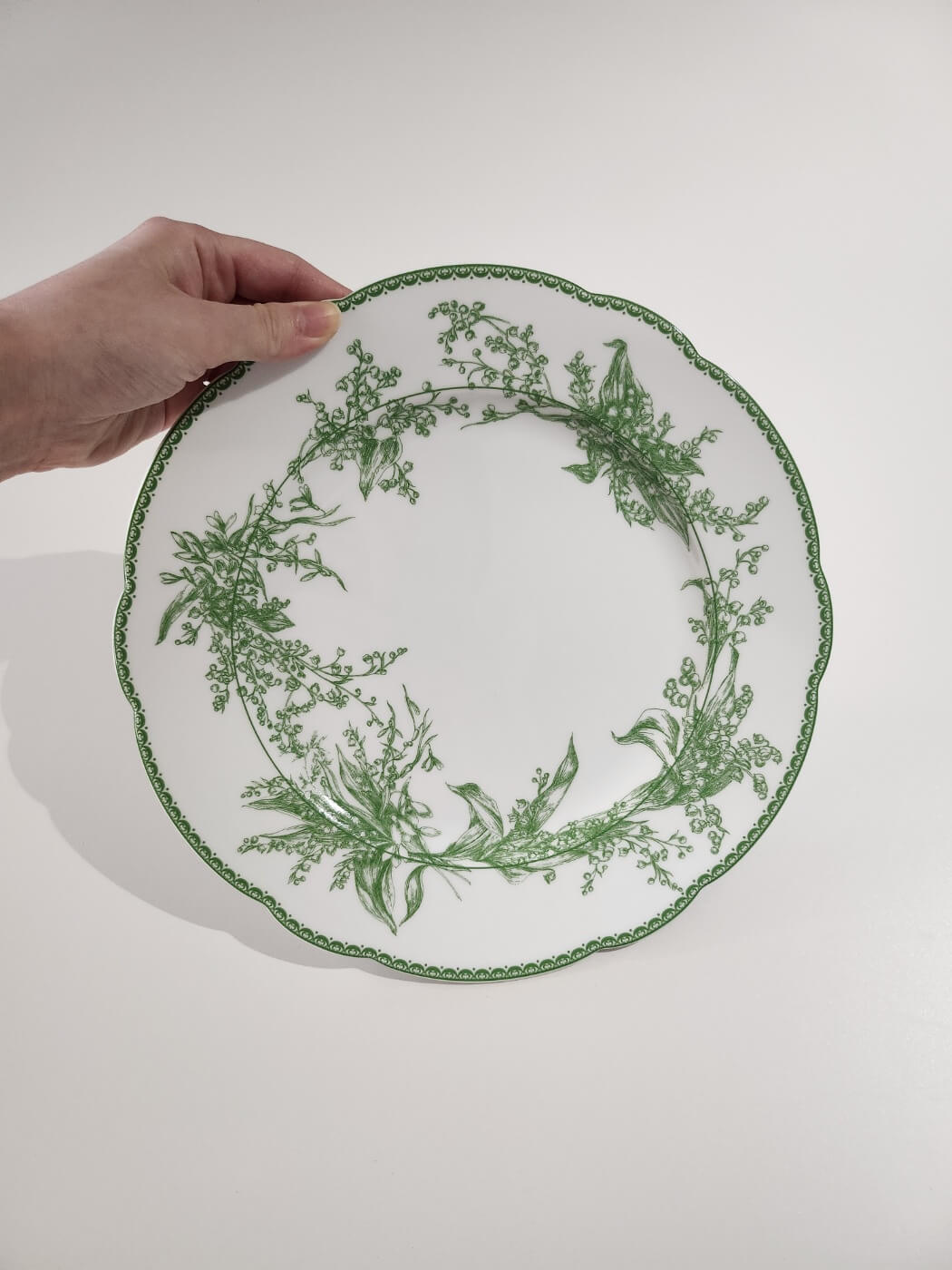 제 생애 첫 명품 그릇입니다. 디올 메종의 릴리 오프 더 벨리 그린 디너 접시예요! 디올 메종 눈팅만 하면서 와 진짜 예쁘다 생각만 했지 살 생각은 못했던 간이 콩알만한 저인데 선물로 받으니 미치게 기분 좋고 더 사고싶어지더라구요. 휴 큰일날뻔! 저렇게 디너 접시에 코디용으로 데코 접시까지 사고 싶었어요. 너무 예쁘지 않나요? 저렇게 그릇 깔아놓고 식사하면 뭘 먹어도 맛이 오백배는 맛있을 것 같아요. 저 접시는 사실 저희집 데코용으로 전시할 계획입니다. 저거 아까워서 어떻게 쓰나요. 그냥 부엌 상부장 불켜놓고 구경하면서 만족하고 살 거랍니다~