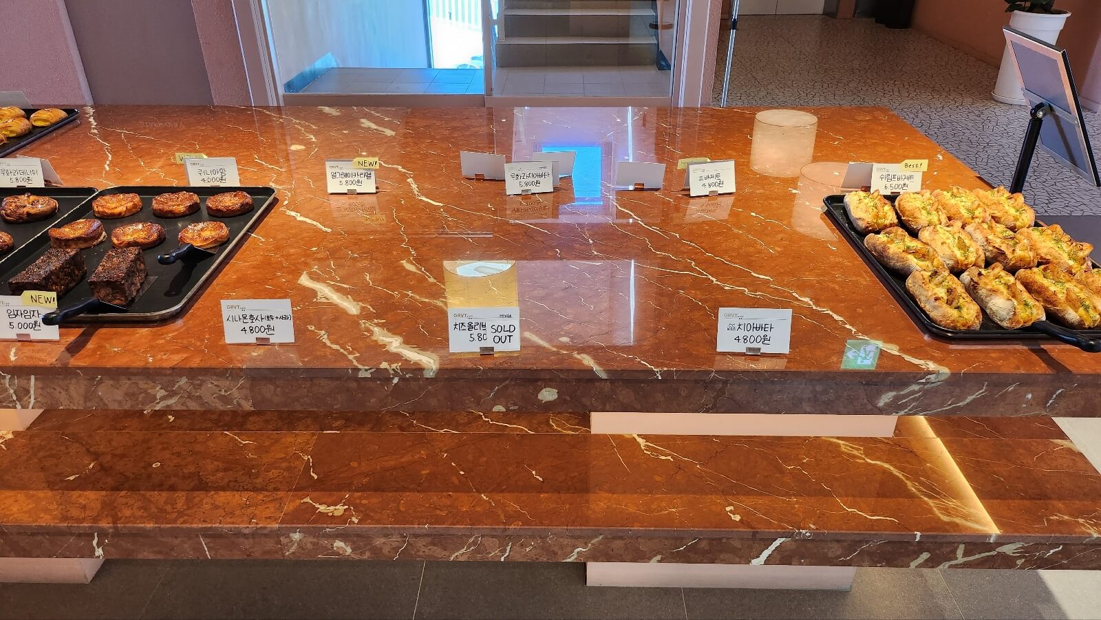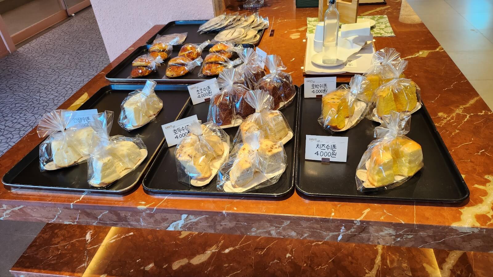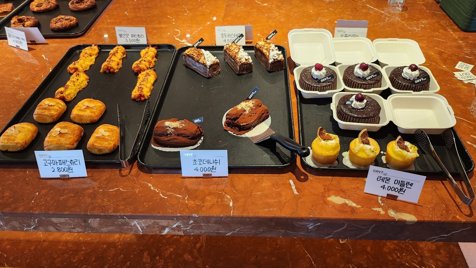 베이커리 카페 GRVT 오픈 시간에 갔기때문에 빵 종류가 많진 않았어요. 나와있는 빵종류가 적은거지 저기 팻말 보시면 아주 다양한 빵이 있었답니다. 저희는 카페에서 시간을 보내다 조리원 들어가서 점심을 또 먹어야 했기 때문에 빵 욕심은 내지 않기로 했어요. 그래도 빵을 보고 그냥 지나칠 순 없으니 하나씩만 고르기로 했답니다. 오픈한지 얼마 안돼서 쇼케이스 습기 찬 거 좀 보세요. 좀 죄송하긴 하더라구요. 부랴부랴 저희를 맞았을 직원 분들 감사합니다. 문전박대하지 않아주셔서 너무 감사해요. 아직 제왕절개 수술 자국이 너무 아파 돌아 나가면 눈물날 것 같았거든요.