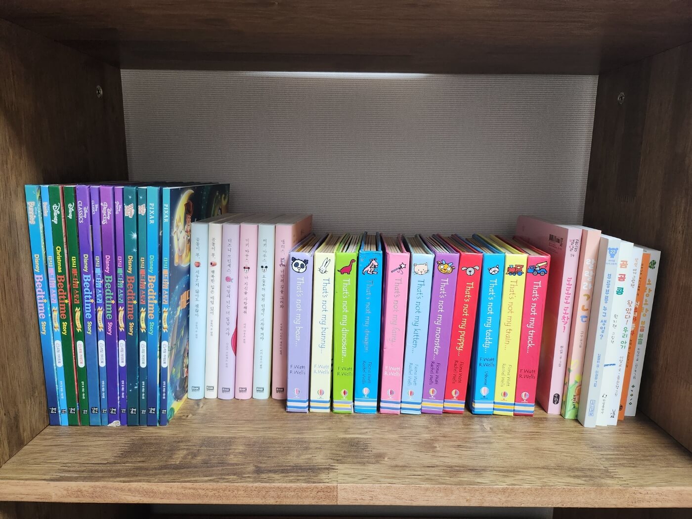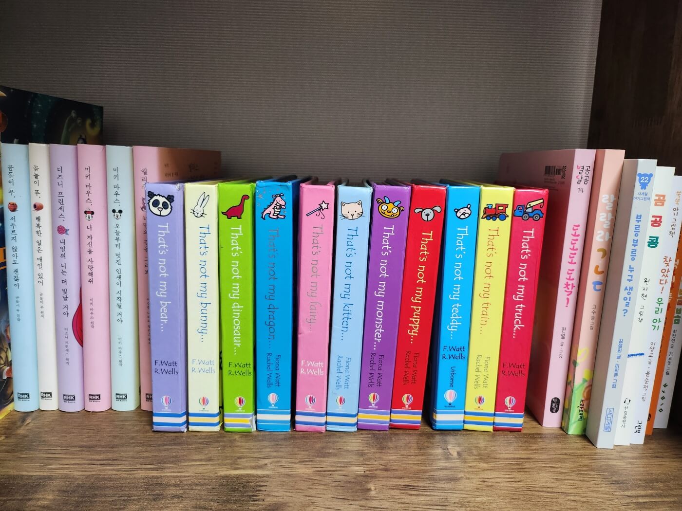신혼집 이사 후 작은 책장을 들여놓고 텅텅 비워뒀었는데 본가에서 조금씩 책을 가져오며 한칸한칸 채우고 있어요. 오른쪽 칸은 아기를 위해 쓰기로 하고 아기책을 모으고 있는데 너무 귀엽지 않나요? 저는 당근에서 처음보고 구매하고 싶었는데 새제품은 웬디북에서 판매하고 있더라구요. 고민하던 중 당근과 YES24 중고책을 이용해 구매해 보았어요. 너무 뿌듯한 저의 어스본 촉감책 컬렉션입니다.