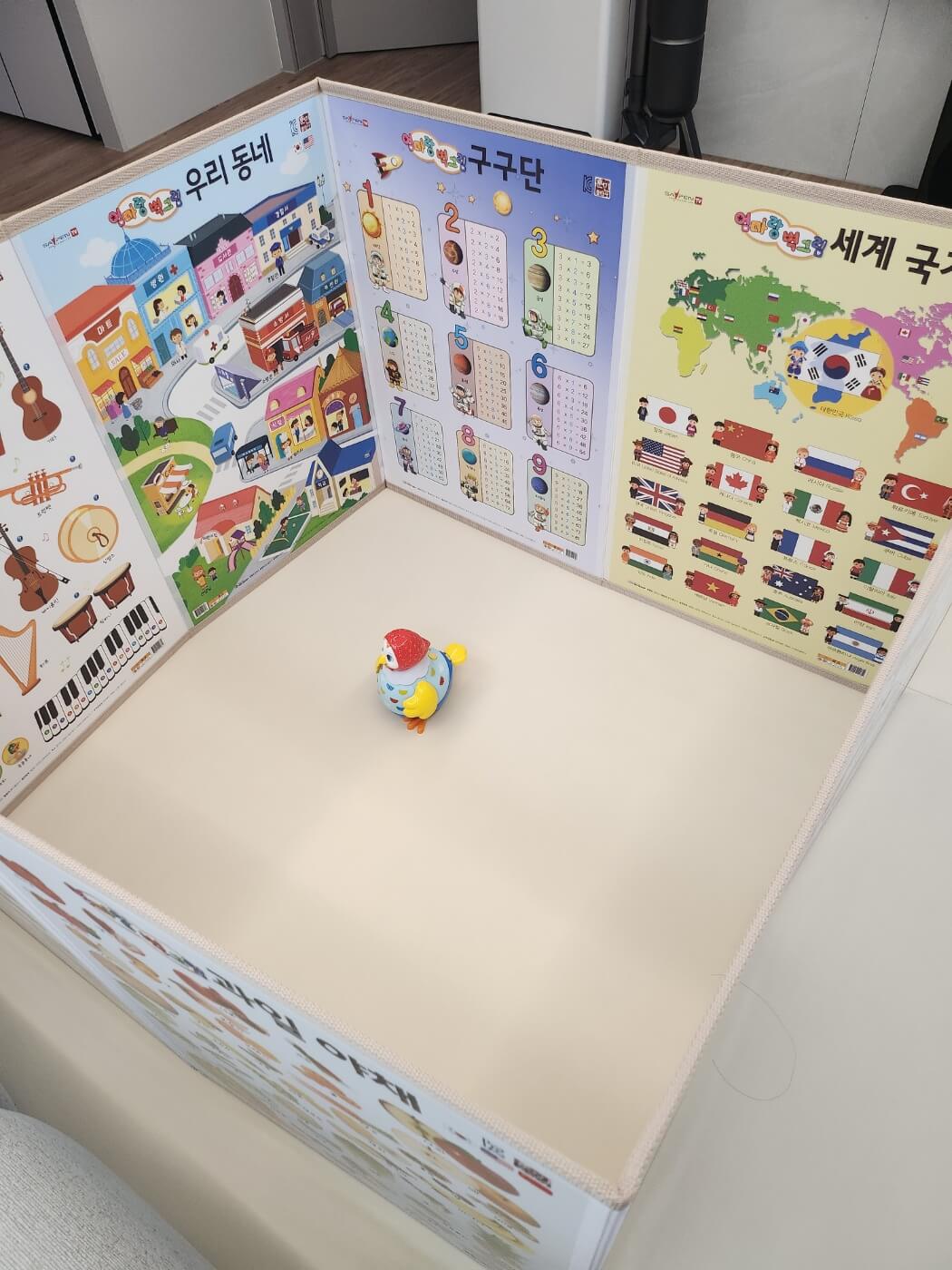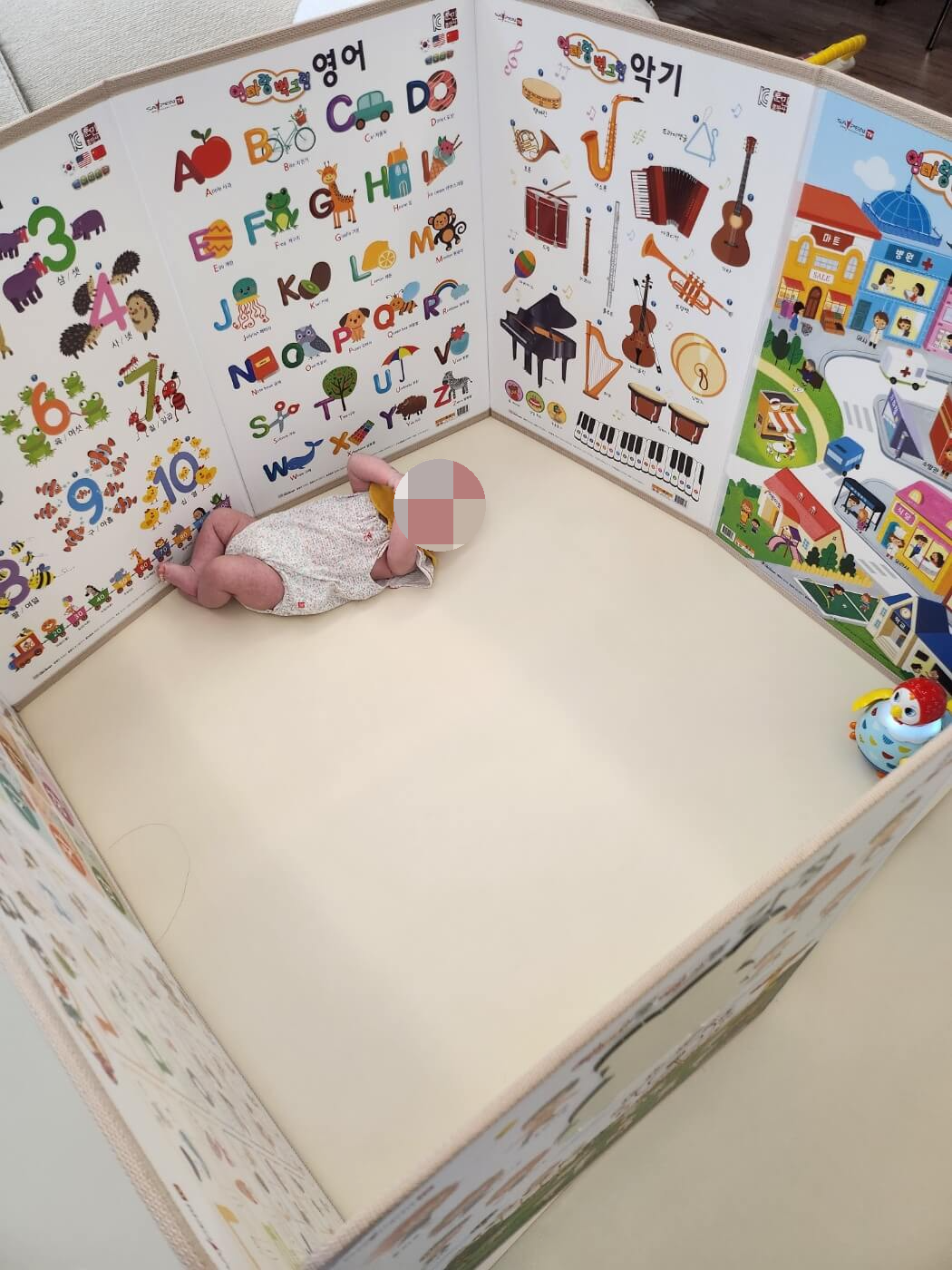 꼬꼬맘과 안에 함께 넣어주니 제일 구석에서 서로를 경계하는 두 녀석들... 너무 귀엽지 않나요? 귀여워 미치겠습니다. 하루하루가 아쉬워요...ㅠㅜ 엄마랑 벽그림 아기 병풍의 또 다른 장점은 사이즈가 엄청 크고 높아서 TV가리개로도 많이들 이용한다고 하시더라구요. 실제로 성인인 제가 저기 안에 들어가서 TV를 보려고 하니 보이지 않더라구요. 너무 만족스러웠습니다. 몰래 야구도 보고 할 수 있겠어요 하하!