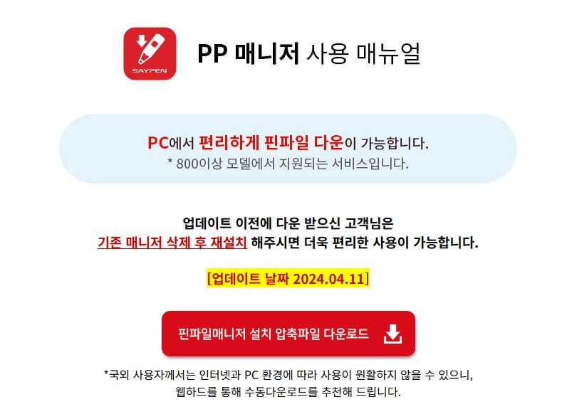 그리고 세이펜 호환 가능한 엄마랑 벽그림! 이용하기 위해서는 세이펜에 엄마랑 벽그림 핀파일을 넣어줘야해요. 어떻게 하는지 몰라 헤맨 것 치고는 빨리 다운로드 받을 수 있었는데요. 우선 세이펜 홈페이지에 들어가 핀파일매니저를 설치해 줍니다. 그냥 온라인에서도 핀파일을 받을 수 있는데, 바로 USB 연결해서 넣었더니 저는 안 되더라구요... 어디서 잘못 했는지 모르겠는데 안되길래 그냥 핀파일 매니저를 설치해서 회원가입 후 다운로드해 보았어요.