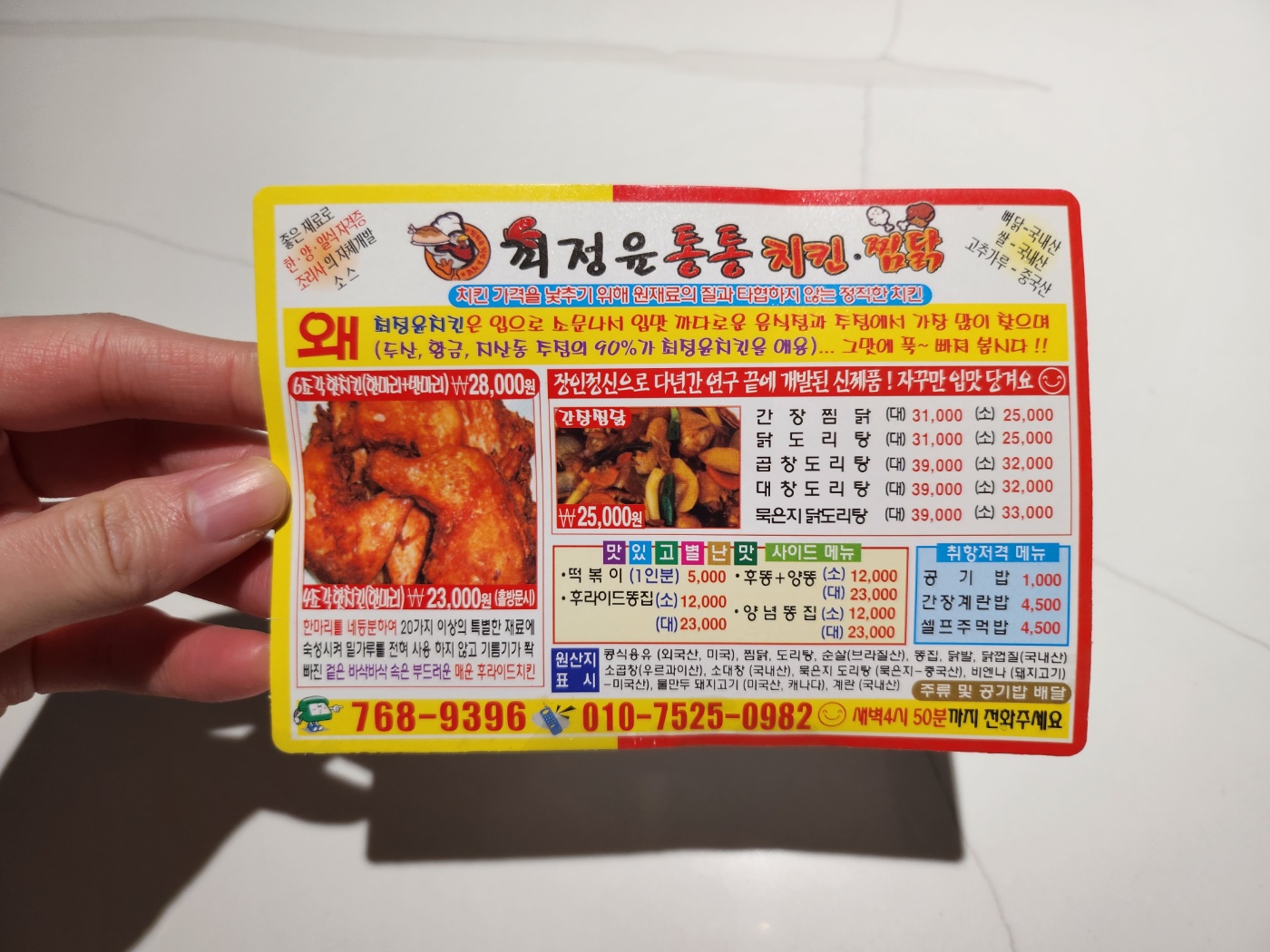 최정윤 통통 치킨&찜닭의 메뉴! 핫치킨은 4조각과 6조각이 있어요. 4조각(한마리) 23,000원 / 6조각(한마리반) 28,000원으로 무조건 6조각으로 주문합니다. 너무 맛있는데 멀기 때문에 큰 거로 주문해서 들고왔습니다. 치킨 외에도 찜닭, 곱도리탕 등 메뉴가 상당히 다양했어요. 다른 것도 궁금하지만 이 치킨이 자꾸 생각 나 당분간은 치킨만 찾을 것 같습니다.