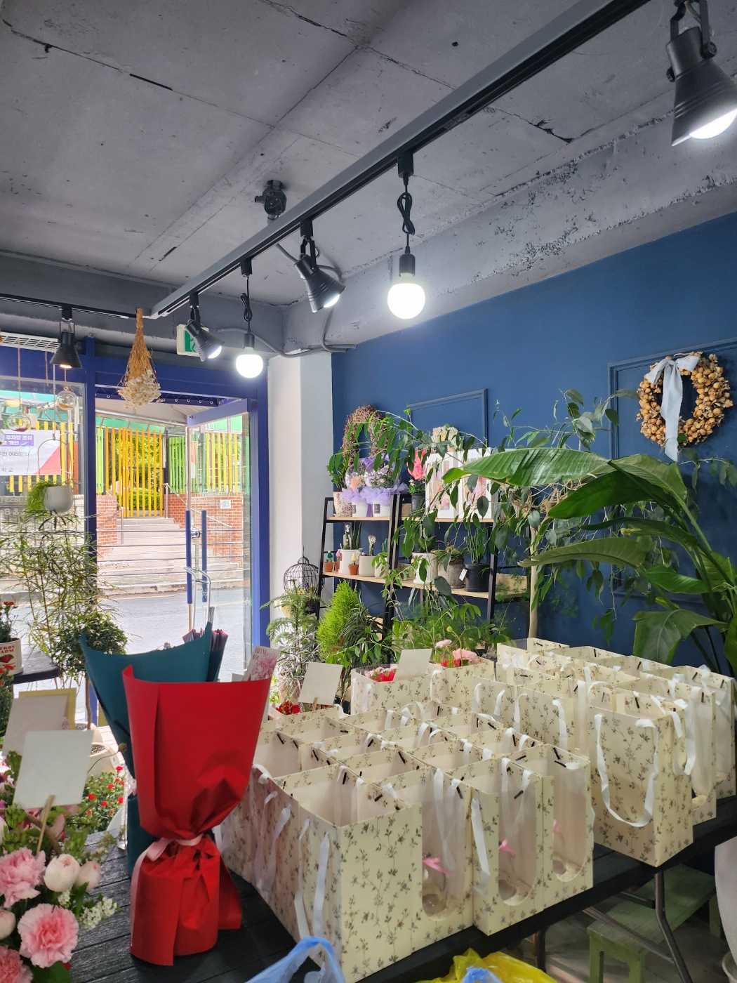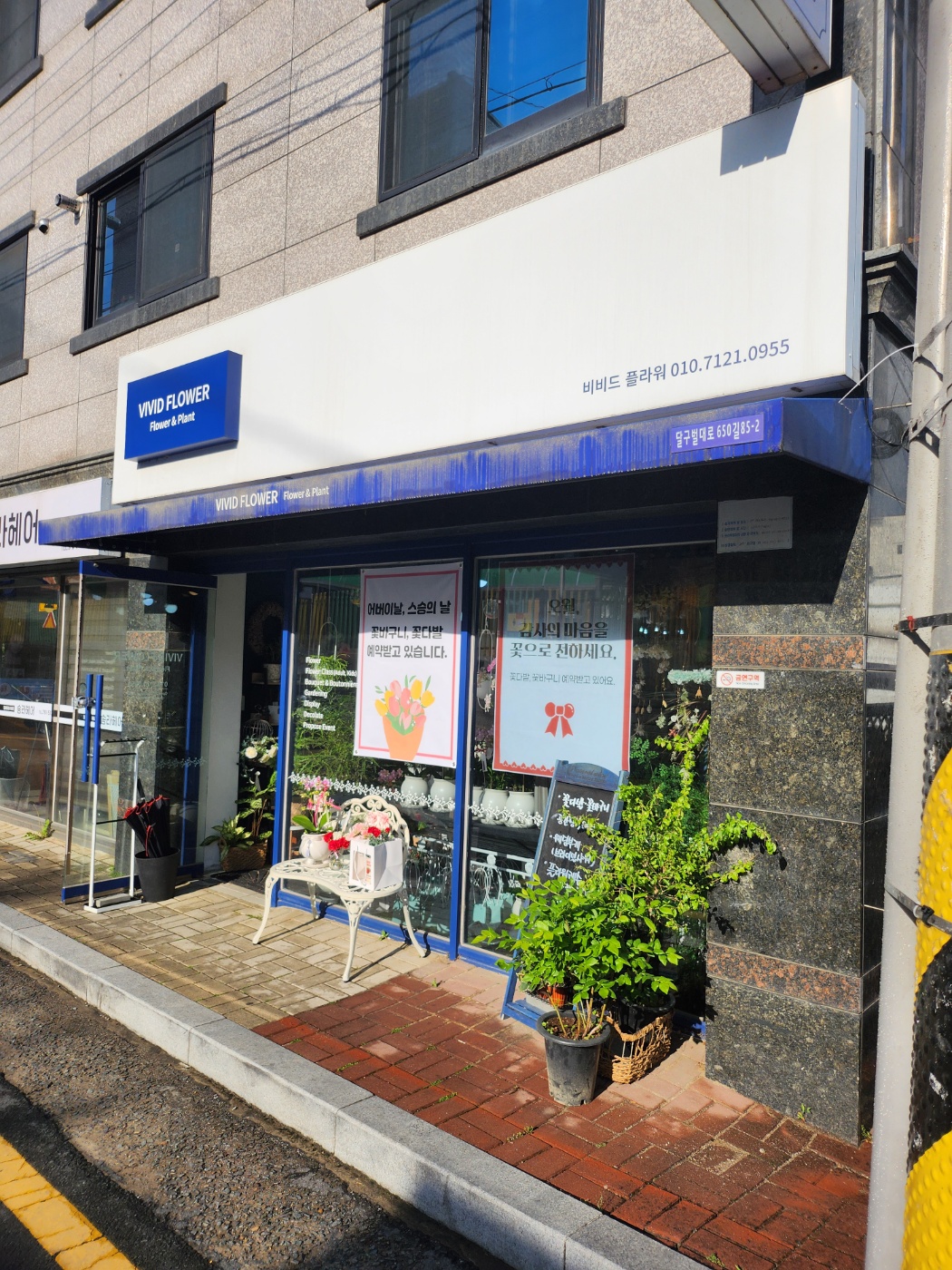 친절한 상담을 통해 요즘 인기 많은 꽃을 추천해주셔서 해당 꽃다발로 예약을 했답니다. 아기와 함께 걸어 꽃을 찾으러 간 시지 꽃집 비비드플라워! 가게 외관에도 꽃나무가 있어 싱그러운 분위기를 자아내요. 가게도 블루앤 화이트 조합이라 외관에서 봐도 화사한 분위기에 기분이 좋아지는 꽃집이랍니다.