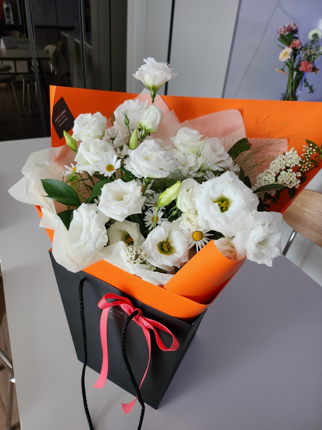 실제로 처음 받은 꽃도 너무 예뻤답니다. 근데 생각보다 너무 하얀 색감에 놀라 유색을 추가할 수 없냐고 문의드렸더니 다양한 조합을 추천해주시면서 다시 방문을 요청하셨어요. 어른들이 있는 자리라 흰 꽃다발이 어색하실까 괜히 걱정이 되었거든요. 그 자체로도 충분히 예뻤지만 걱정되는 맘에 전화했더니 감동의 눈물...