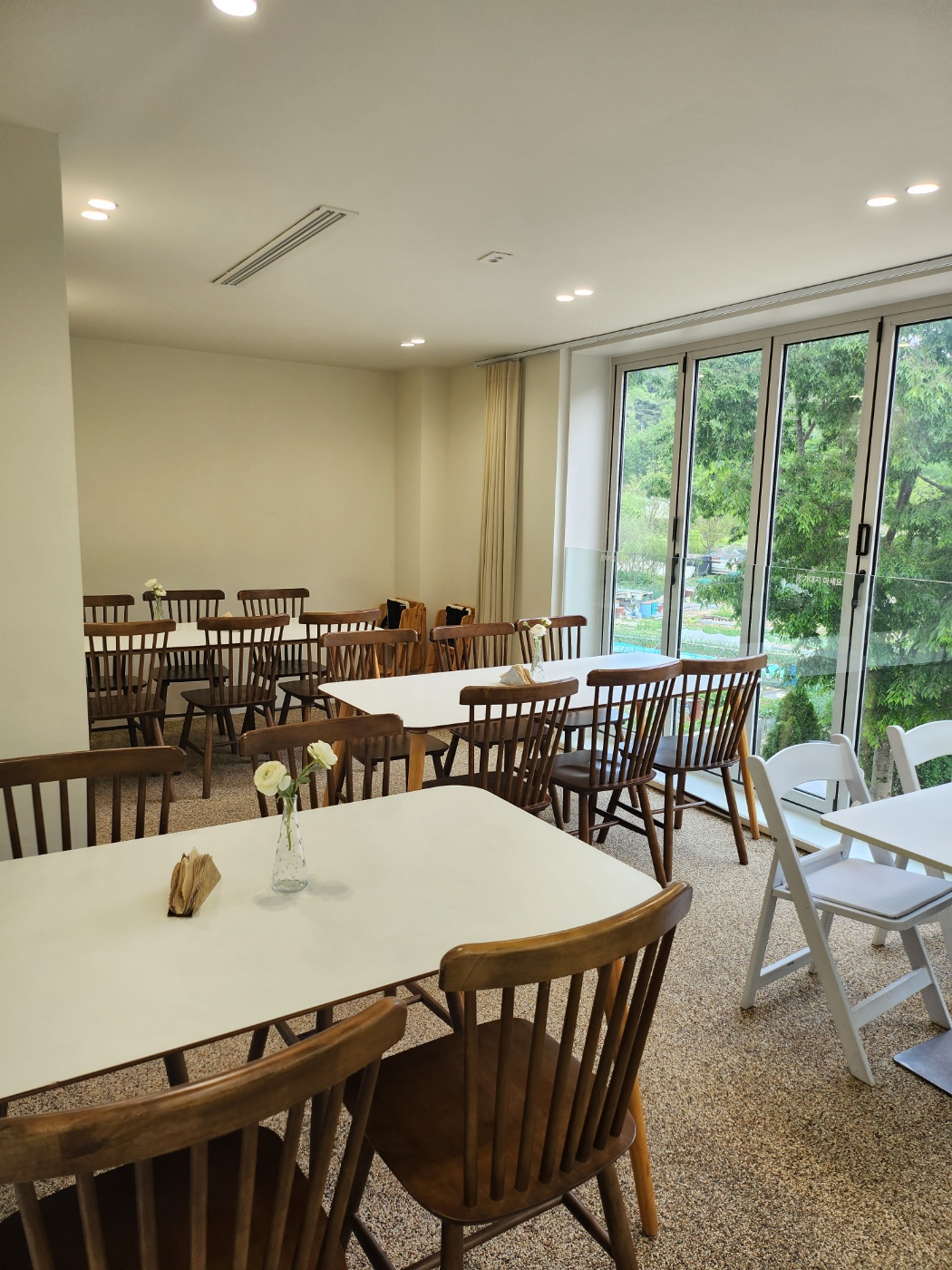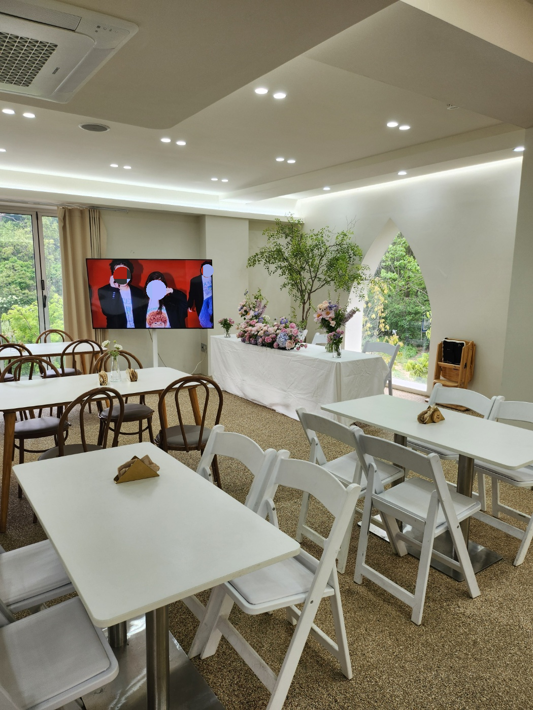 프리아 웨딩 2층 리아홀에서 밖으로 내려다보면 웨딩 버진로드가 펼쳐져요. 뷰도 예뻐서 실제로 식이 있는 날이었다면 더욱 예쁘긴 할 것 같아요. 프리아 웨딩은 대관, 식사, 돌상만 필수이며 그 외에는 별도로 선정할 수 있으며, 요청 시 연계업체 연결을 도와주신다고 합니다. 또 모니터로 아기 성장영상을 당일 USB에 담아 가져오면 틀어주신다고 해요. 사회의 경우 직접 진행 시 식순과 음원을 지원해주신다고 해요!