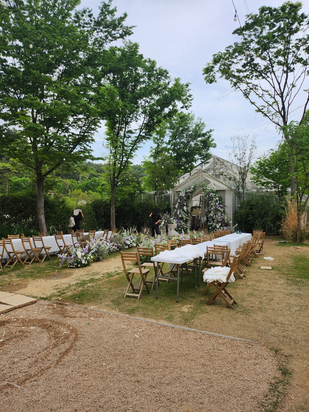 야외 결혼식으로 인해 꽃 장식이 있는데 끝났을 타임이라 정리를 하고 계셨어요. 예쁜 생화와 초록이 우거져서 너무 예쁘더라구요. 예쁜 결혼식이 되었을 것 같아요. 실제로 프리아 웨딩하면 저 실내 구조물도 유명한데 돌잔치 스냅 촬영 시에는 오픈을 안 해준다고 하시더라구요. 그래도 그 외 야외 공간 모두 자유롭게 이용하면 된다고 하셨습니다.