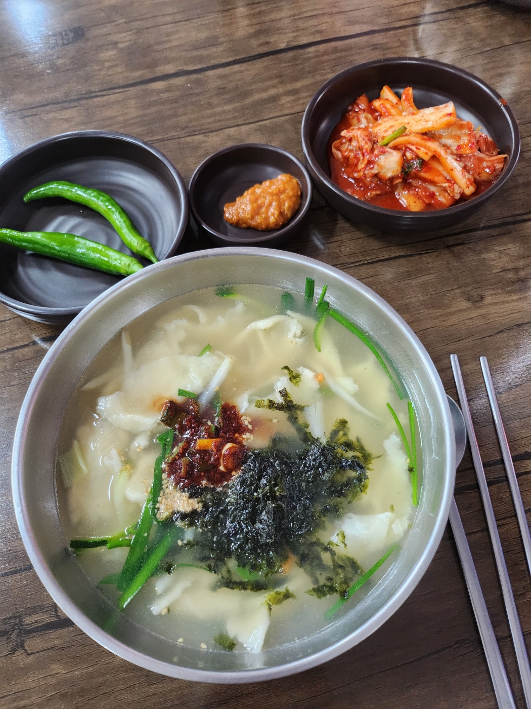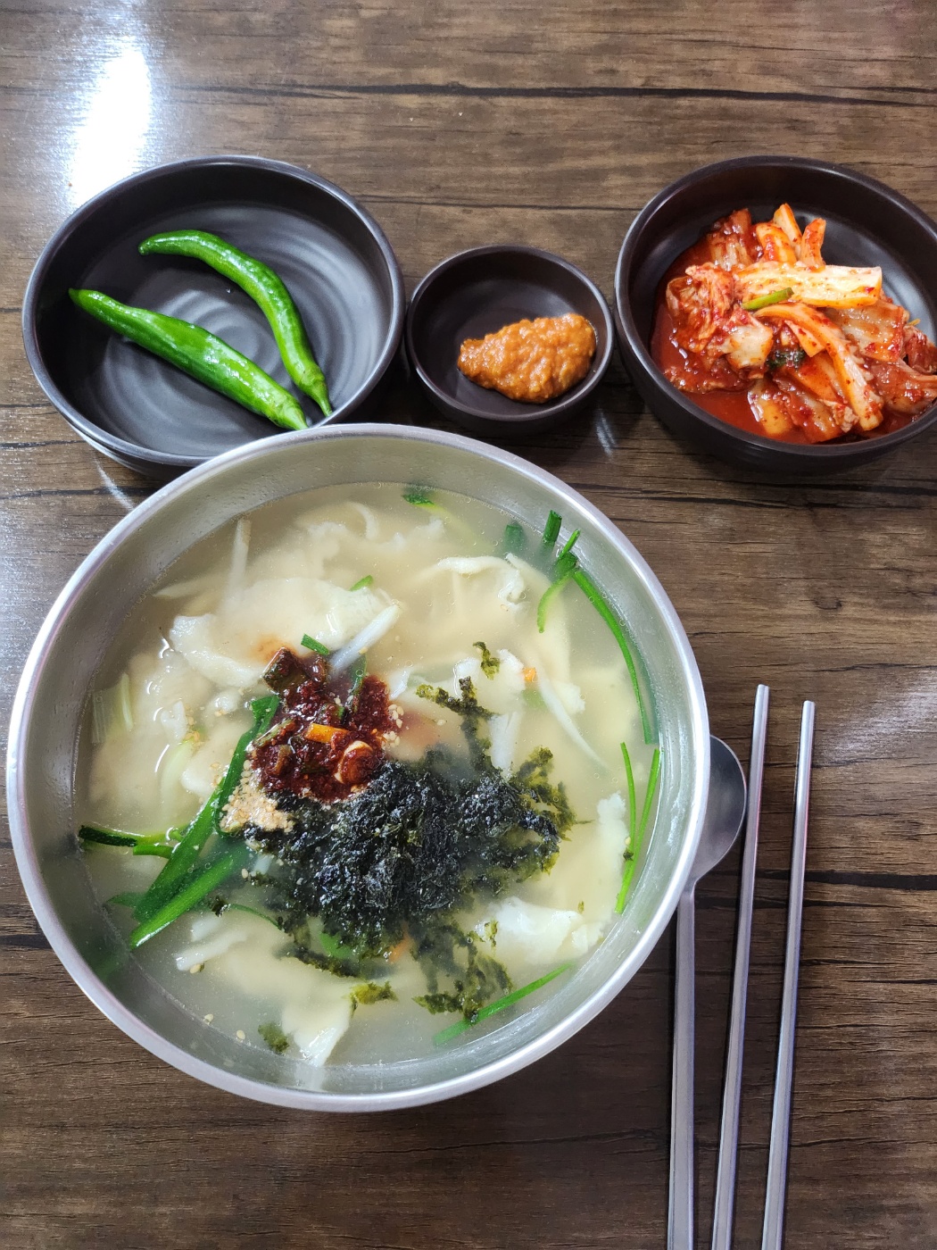 가게 구경하며 수다 좀 떨다보니 금새 수제비가 나왔어요. 밑반찬은 깔끔하게 김치, 고추, 된장이고 바로 메인을 주신답니다. 수제비 위에 장과 김가루가 올려져있고 섞어 먹으면 극락~ 아버지는 원래 극 잔치국수파이신데 이 날은 수제비 한 그릇을 뚝딱 하셨답니다. 정평역 수제비 맛집 칼국수한그릇의 가장 큰 단점은 양이 적다는 것이예요. 너무 맛있어서 일까요... 저도 제법 소식하는데 칼국수한그릇은 늘 좀 아쉽답니다. 양 조금만 늘려주세요... 그만큼 맛있어서겠죠? 너무너무 맛있는 경산 중방동 맛집 칼국수한그릇!
