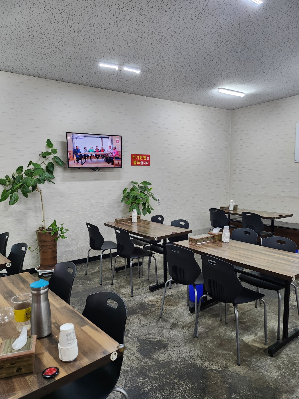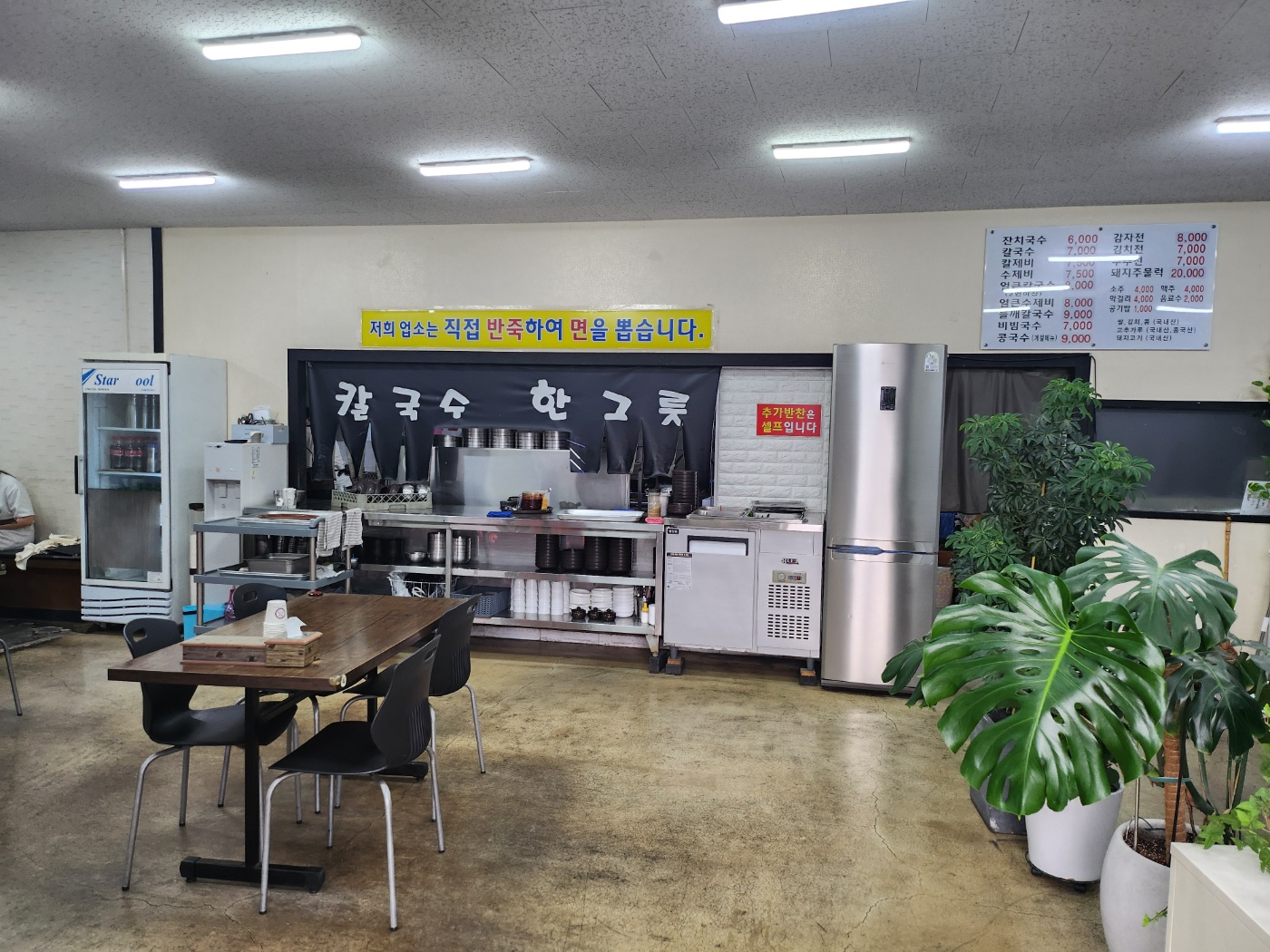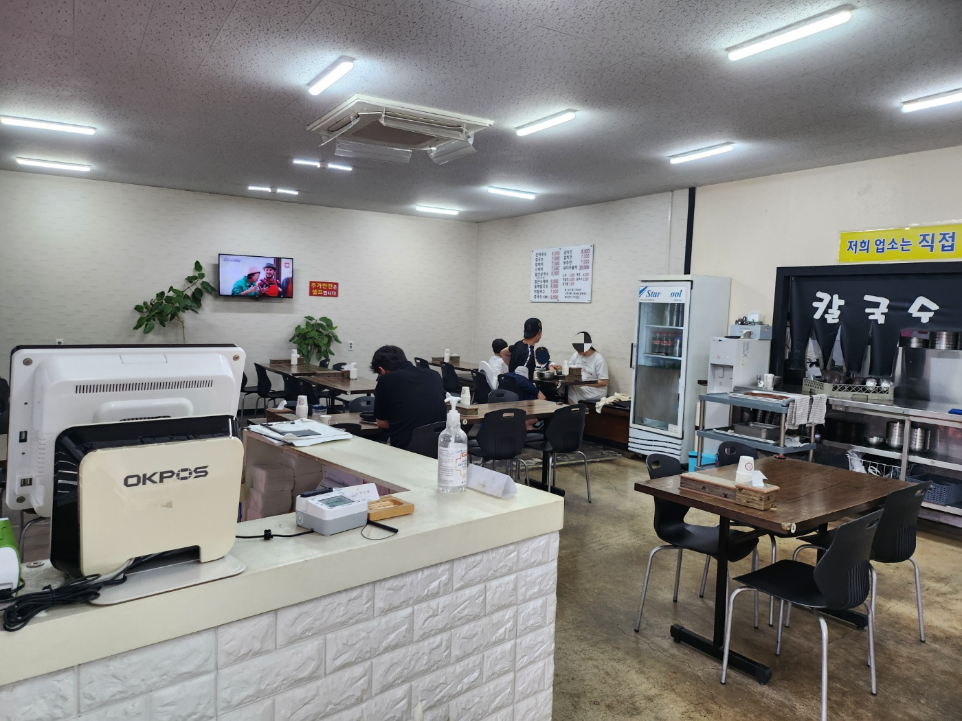 가게 앞에 큰 주차장이 있어 주차장 걱정없는 경산 음식점 중 하나예요. 운전을 하다보니 주차장에 대한 수요가 꽤나 높아졌답니다. 가게 바로 앞에 넓은 주차장이 있어 쏘 나이스. 물론 다른 가게들과 공용으로 사용하는 곳이지만 그래서 주차장이 아주 커 너무너무 좋답니다. 가게 내부로 들어서면 테이블 수는 제법 돼서 늘 자리가 부족하진 않았어요. 입구에서 딱 들여다보면 보이는 주방! 저기서 국수가 뿅하고 나오면 서빙을 해주시더라구요.
