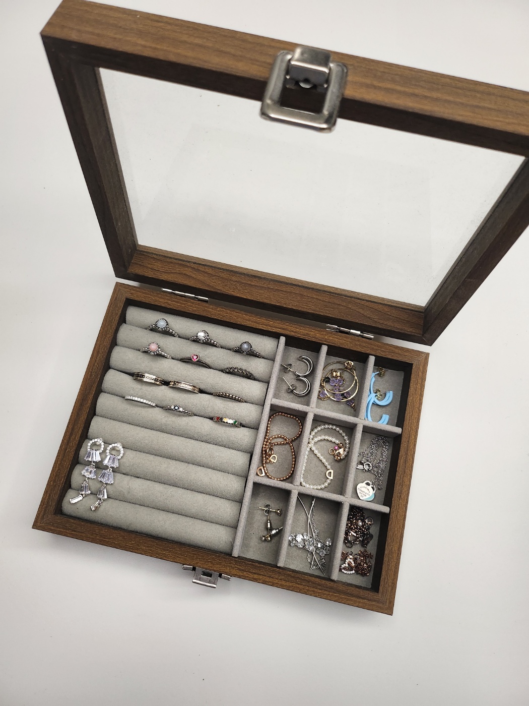 짠 조립이 완료된 모습입니다. 왼쪽은 반지, 귀걸이 칸이고 오른쪽은 목걸이나 팔찌 같은 걸 넣어주면 된답니다. 조립하고나니 처음 좀 실망했던 모습에서 어 내가 본 거 맞아! 하는 비주얼이 되었어요. 여기에 제 예쁜이들을 하나둘 넣어주다보니 채우는 재미가 있더라구요. 사실 앞으로 많이 사모을거니까 더 큰걸 사야하나 했는데 그냥 전 직관적으로 바로 보이게 이런 1단짜리를 여러개 사면 되겠다 싶더라구요. 다시 생각해도 참 잘한 것 같습니다. 너무 만족스럽거든요!