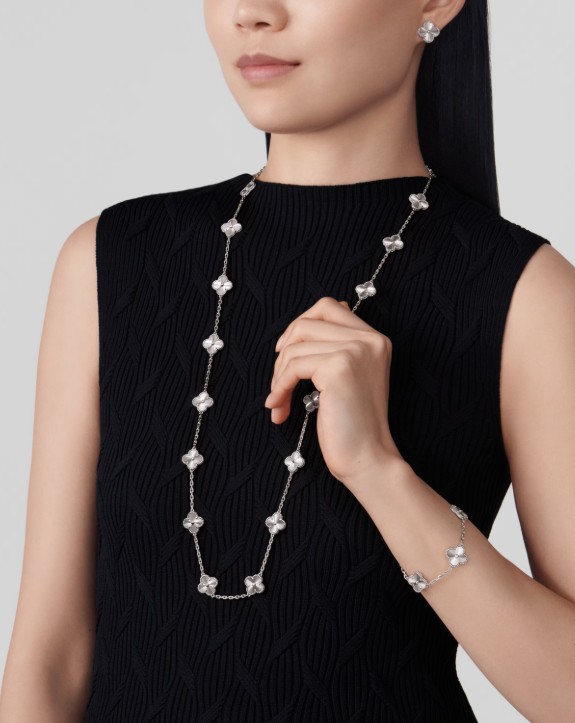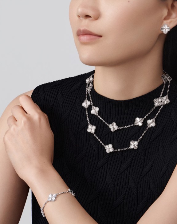 다음으론 알함브라 5모티브 기요세 화이트 골드 버전입니다. 가격은 1,130만원으로 역시나 옐골에 비해 높은 몸값을 자랑한답니다. 화이트골드도 개미지옥이라고 하던데 전 아직 개인적으론 옐골이 제일 예쁜 것 같아요. 사실 저한텐 로골이 잘 어울리는데 전 그냥 제가 좋아하는 걸 예쁘다고 생각한답니다. 하하! ㅋㅋㅋㅋㅋ 반클리프 알함브라 라인은 전세계적으로 인기가 많은데 한번 빠지면 출구가 없어서 큰일이예요. 원석과 골드, 다이아 버전으로 다양하게 나오니 이건 뭐 출구없는 회전문~